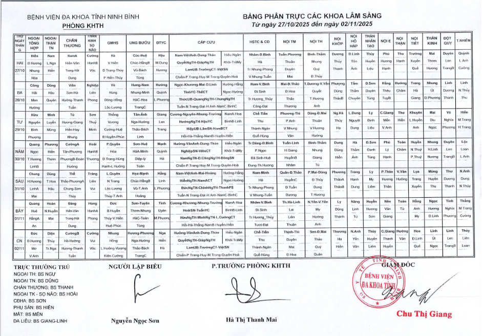 Bảng phân trực các khoa Lâm sàng (từ ngày 27 tháng 10 đến 2 tháng 11 năm 2025).