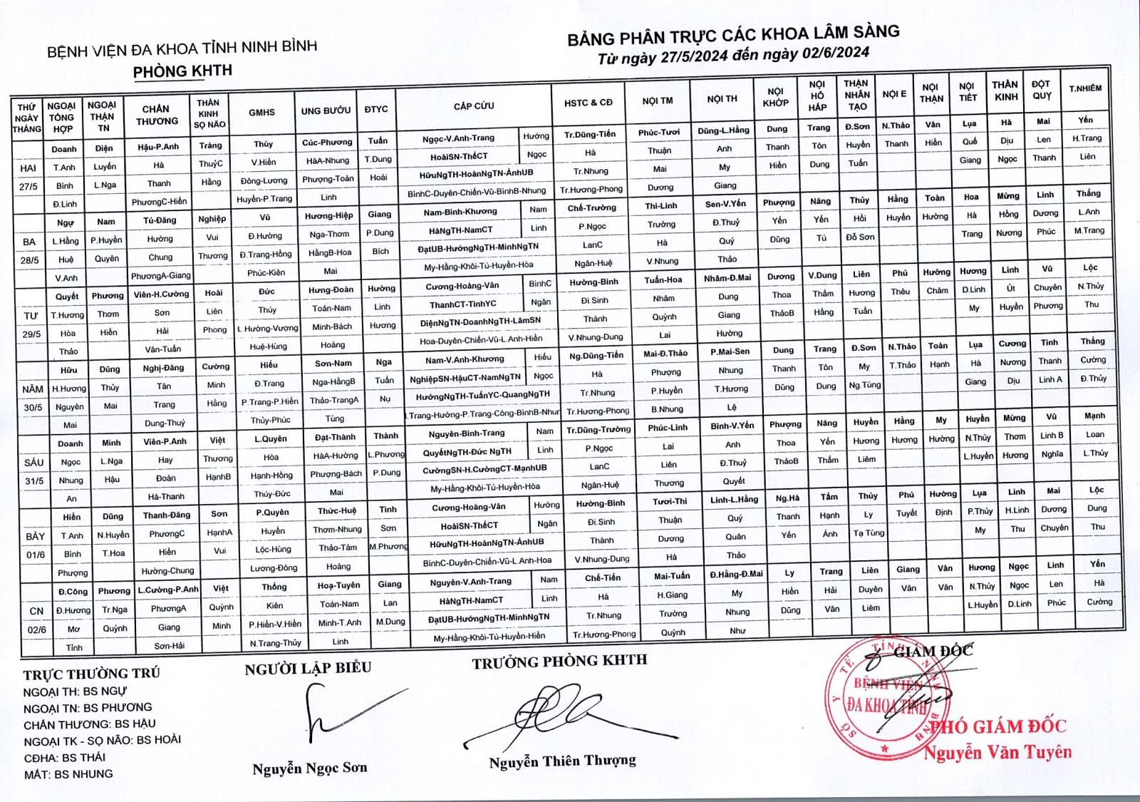 Bảng phân trực các khoa Lâm sàng (từ ngày 27 tháng 5 đến ngày 2 tháng 6 năm 2024).