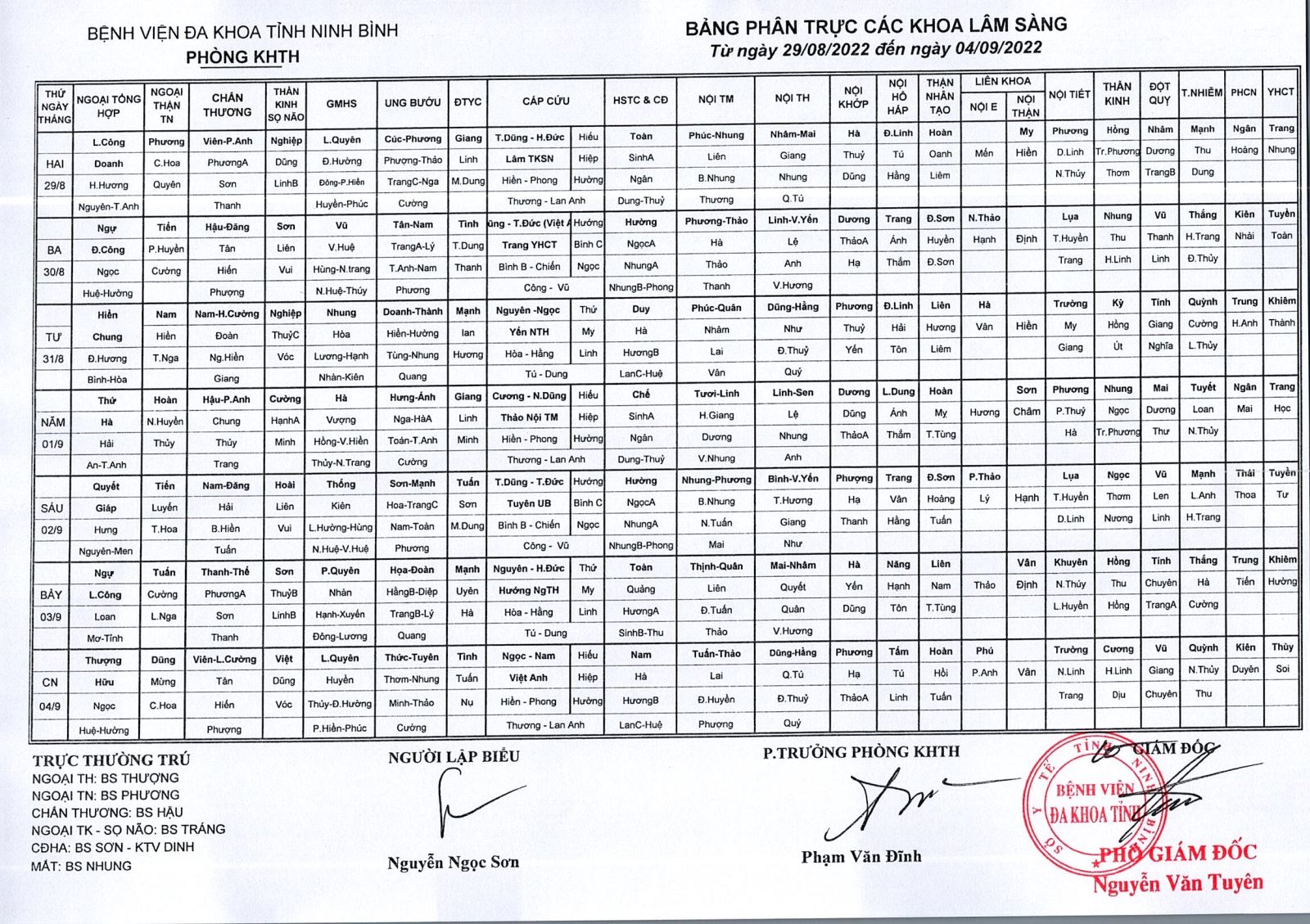 Bảng phân trực các khoa Lâm sàng (từ ngày 29 tháng 8 đến ngày 4 tháng 9 năm 2022)