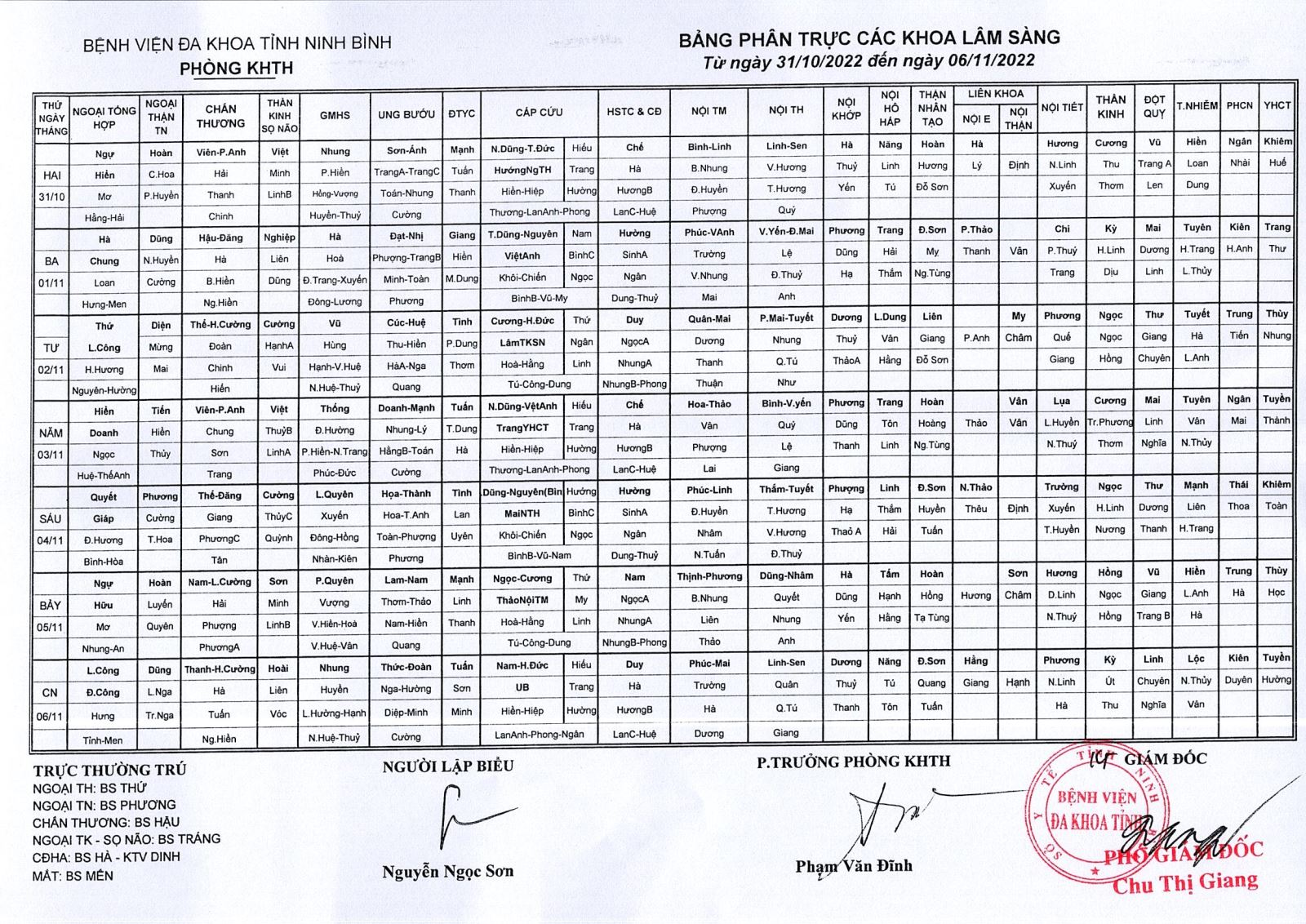 Bảng phân trực các khoa Lâm sàng (từ ngày 31 tháng 10 đến ngày 6 tháng 11 năm 2022)