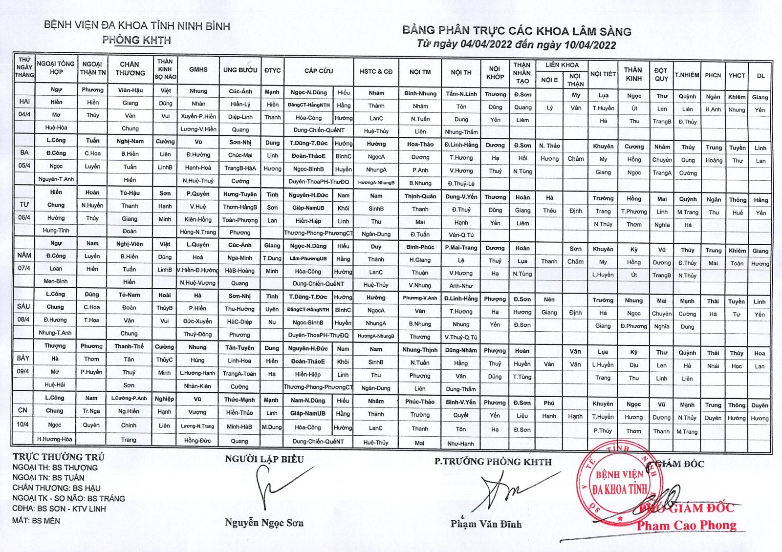 Bảng phân trực các khoa Lâm sàng (từ ngày 4 đến ngày 10 tháng 4 năm 2022).
