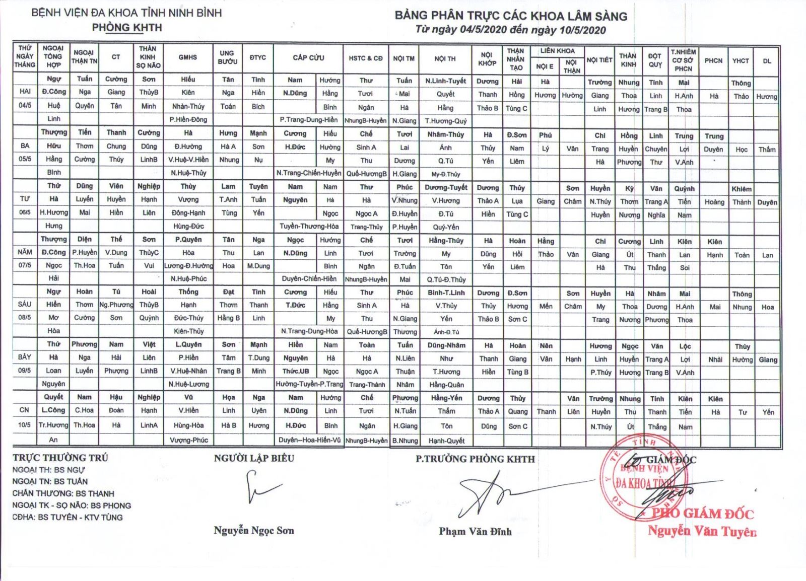Bảng phân trực các khoa Lâm sàng (từ ngày 4 đến ngày 10 tháng 5 năm 2020).