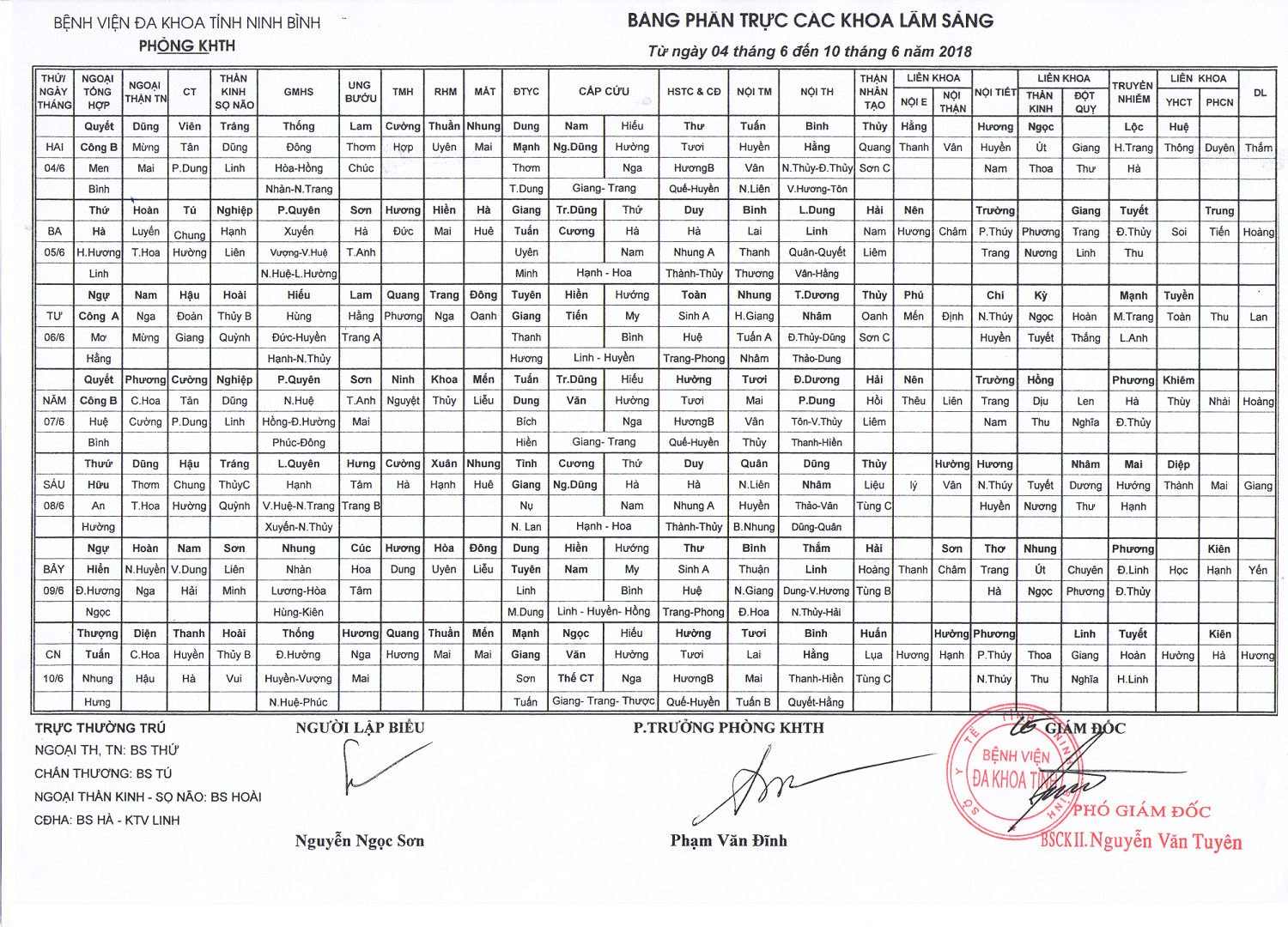 Bảng phân trực các khoa Lâm sàng từ ngày 4 đến ngày 10 tháng 6 năm 2018