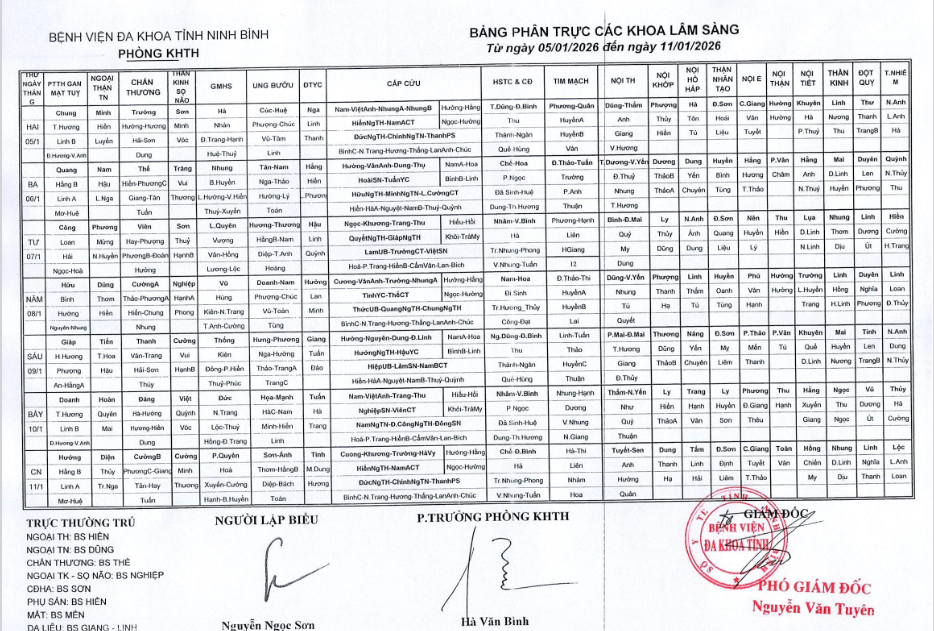 Bảng phân trực các khoa Lâm sàng (từ ngày 5 đến ngày 11 tháng 1 năm 2026).