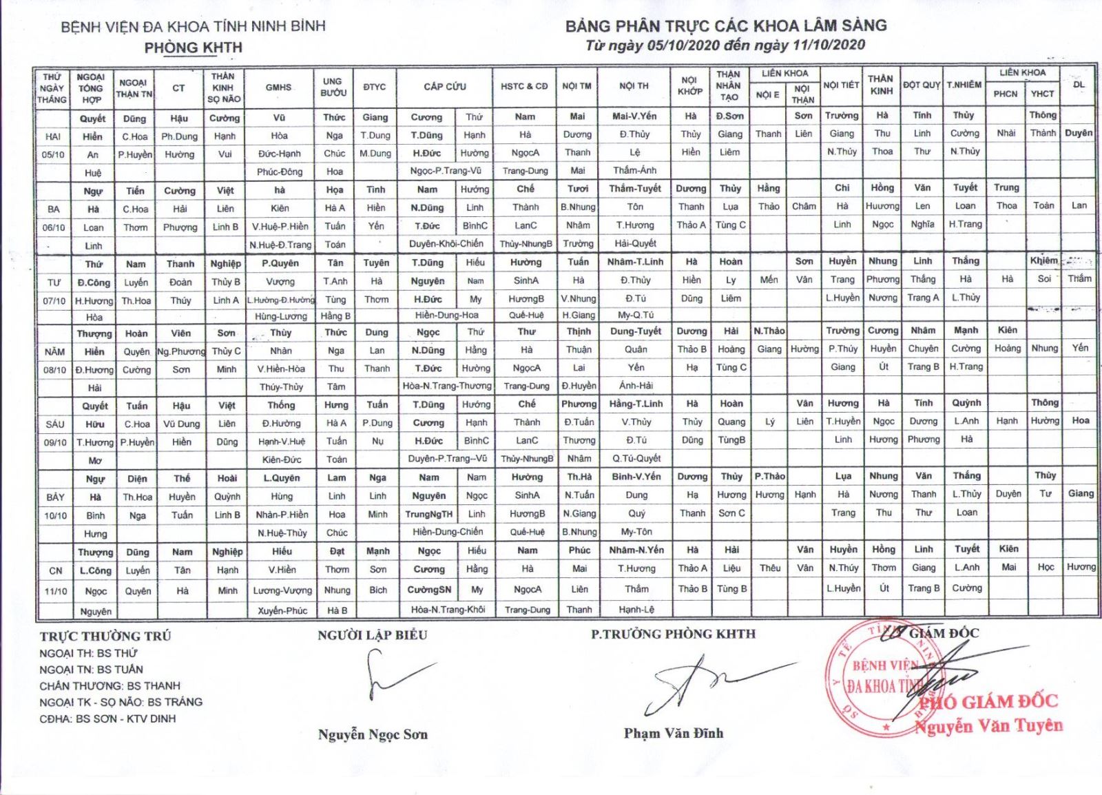Bảng phân trực các khoa Lâm sàng (từ ngày 5 đến ngày 11 tháng 10 năm 2020)