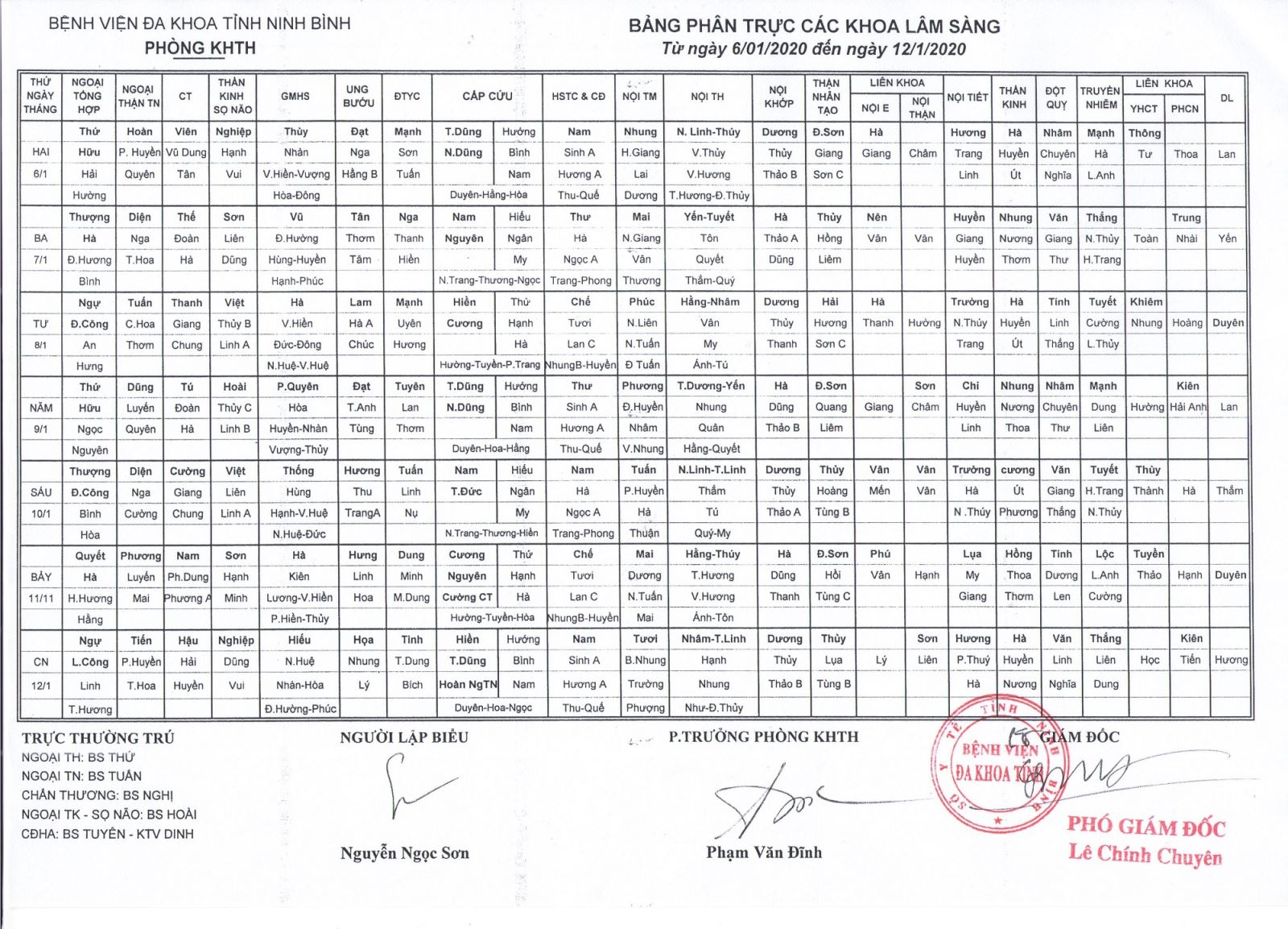 Bảng phân trực các khoa Lâm sàng (từ ngày 6 đến ngày 12 tháng 1 năm 2020)