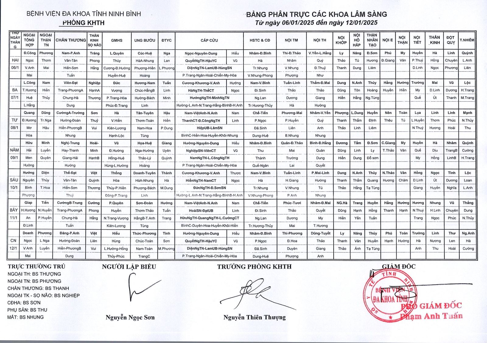 Bảng phân trực các khoa Lâm sàng (từ ngày 6 đến ngày 12 tháng 1 năm 2024)