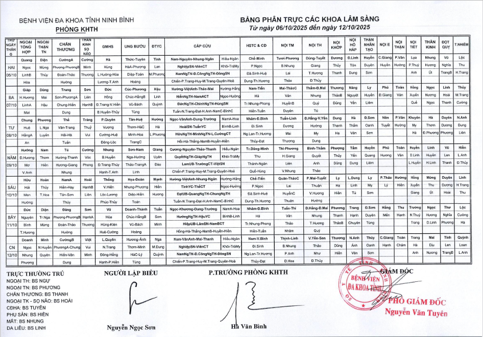 Bảng phân trực các khoa Lâm sàng (từ ngày 6 đến ngày 12 tháng 10 năm 2025).