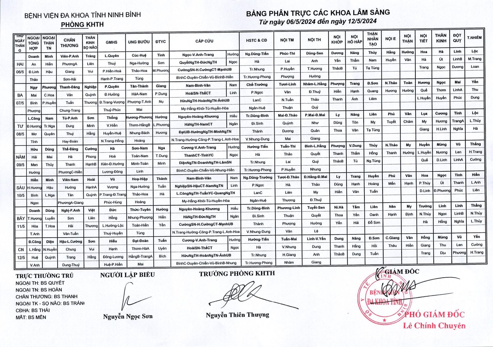 Bảng phân trực các khoa Lâm sàng (từ ngày 6 đến ngày 12 tháng 5 năm 2024).