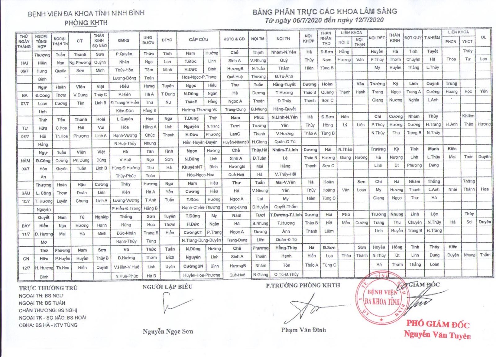 Bảng phân trực các khoa Lâm sàng (từ ngày 6 đến ngày 12 tháng 7 năm 2020)