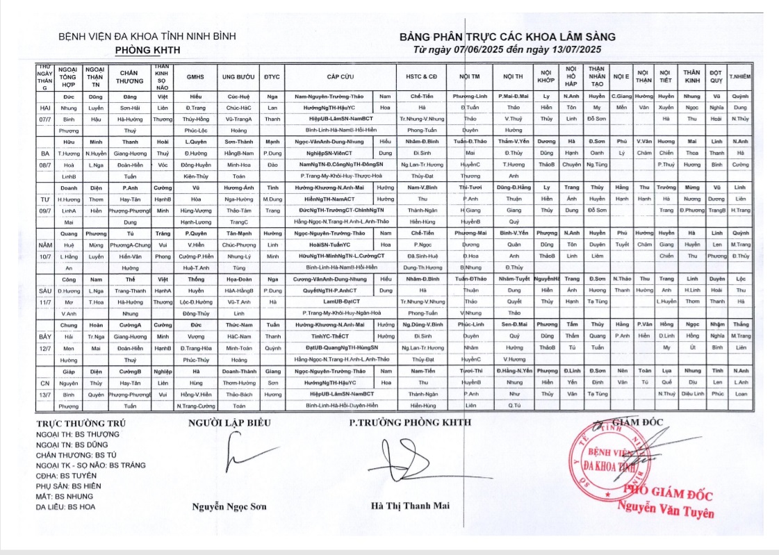 Bảng phân trực các khoa Lâm sàng (từ ngày 7 đến ngày 13 tháng 7 năm 2025)