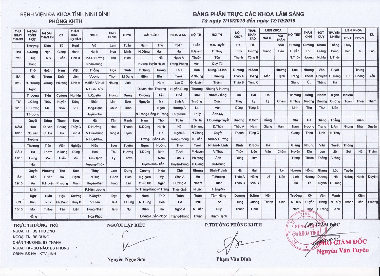 Bảng phân trực các khoa Lâm sàng (từ ngày 7 đến ngày13 tháng10 năm 2019)