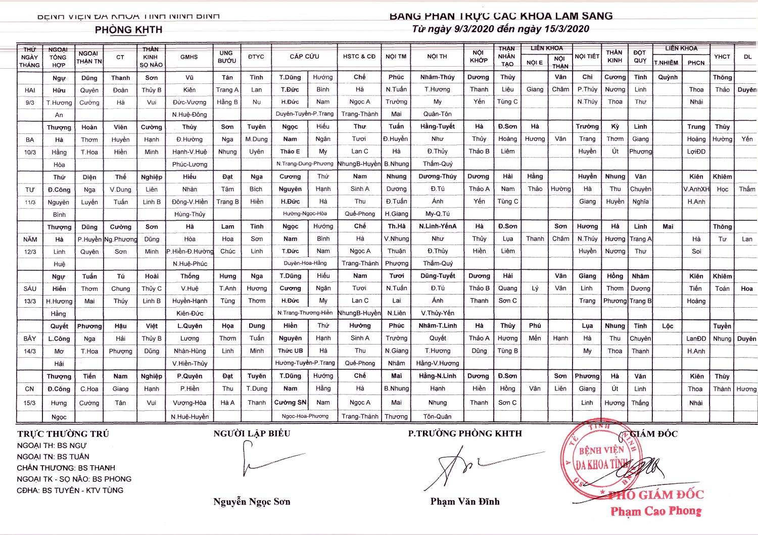 Bảng phân trực các khoa Lâm sàng (từ ngày 9 đến ngày 15 tháng 3 năm 2020)