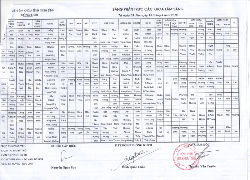Bảng phân trực các khoa Lâm sàng (từ ngày 9 đến ngày 15 tháng 4 năm 2018)