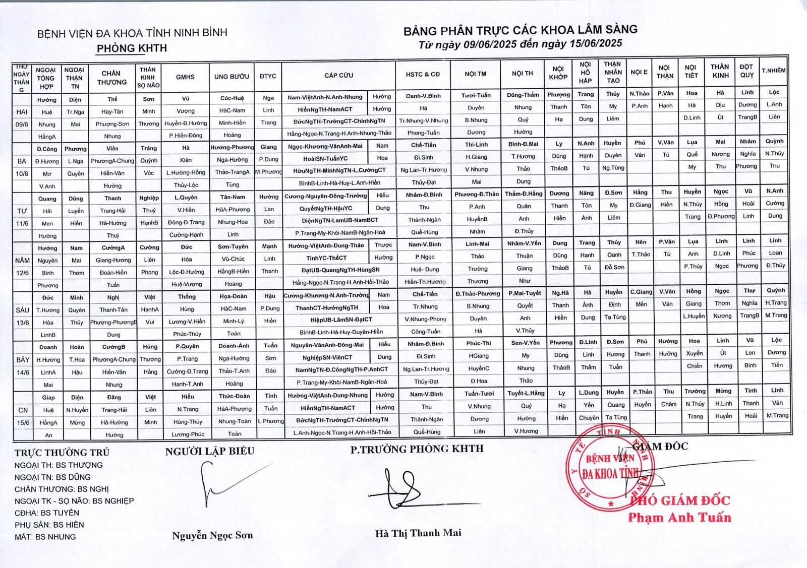 Bảng phân trực các khoa Lâm sàng (từ ngày 9 đến ngày 15 tháng 6 năm 2025).