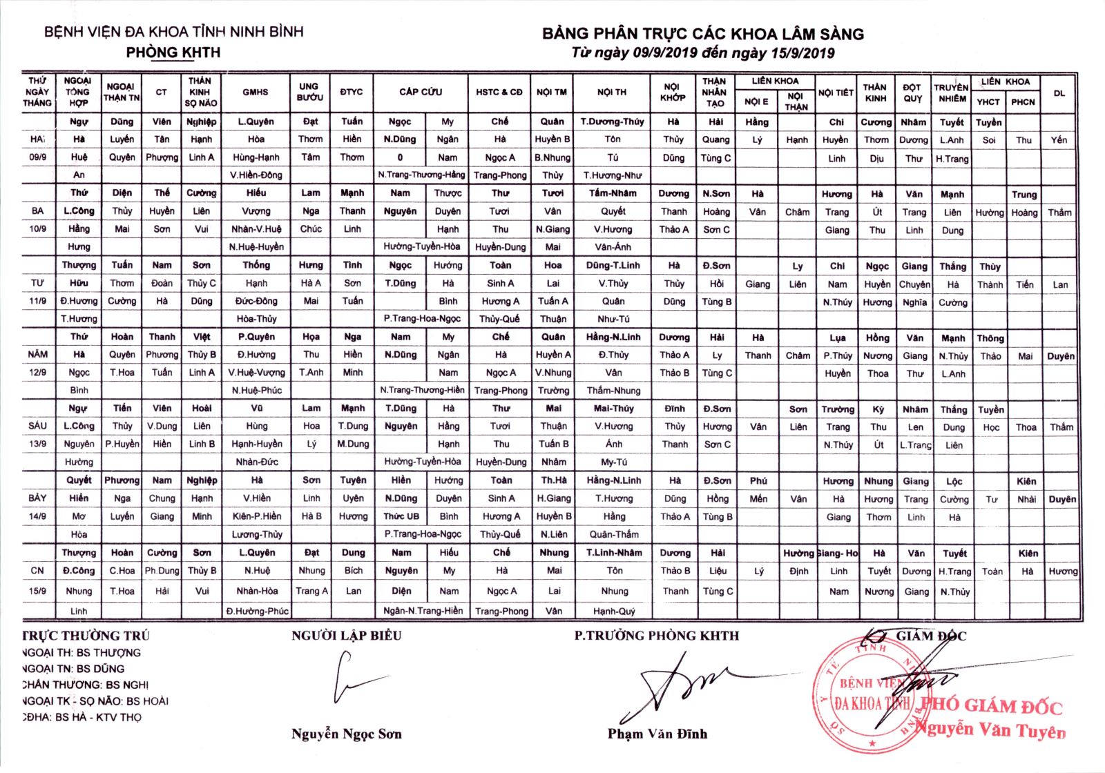 Bảng phân trực các khoa Lâm sàng (từ ngày 9 đến ngày 15 tháng 9 năm 2019)