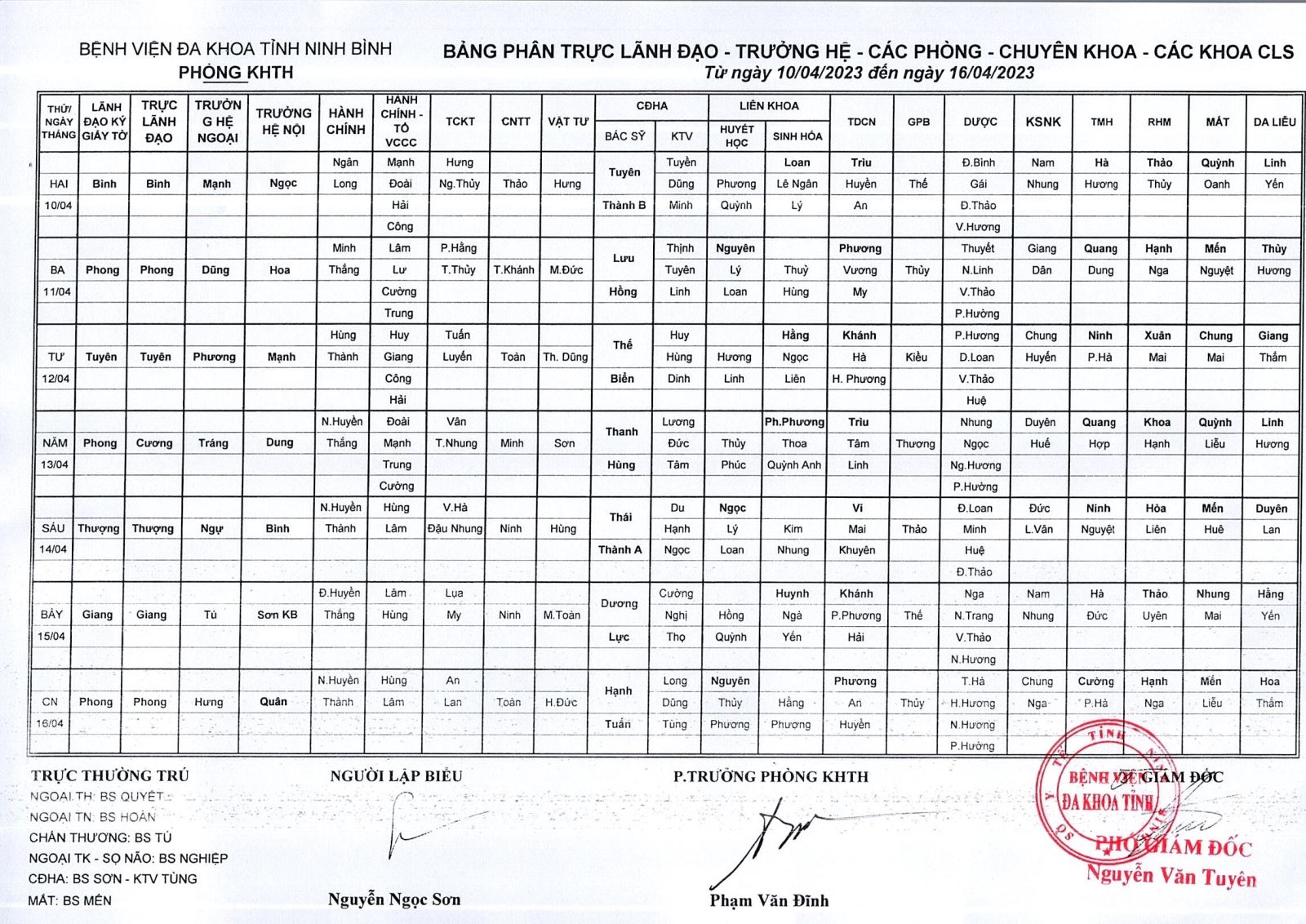 Bảng phân trực Lãnh đạo - Trưởng hệ - các phòng - chuyên khoa - các khoa CLS (từ ngày 10 đến ngày 16 tháng 4 năm 2023).
