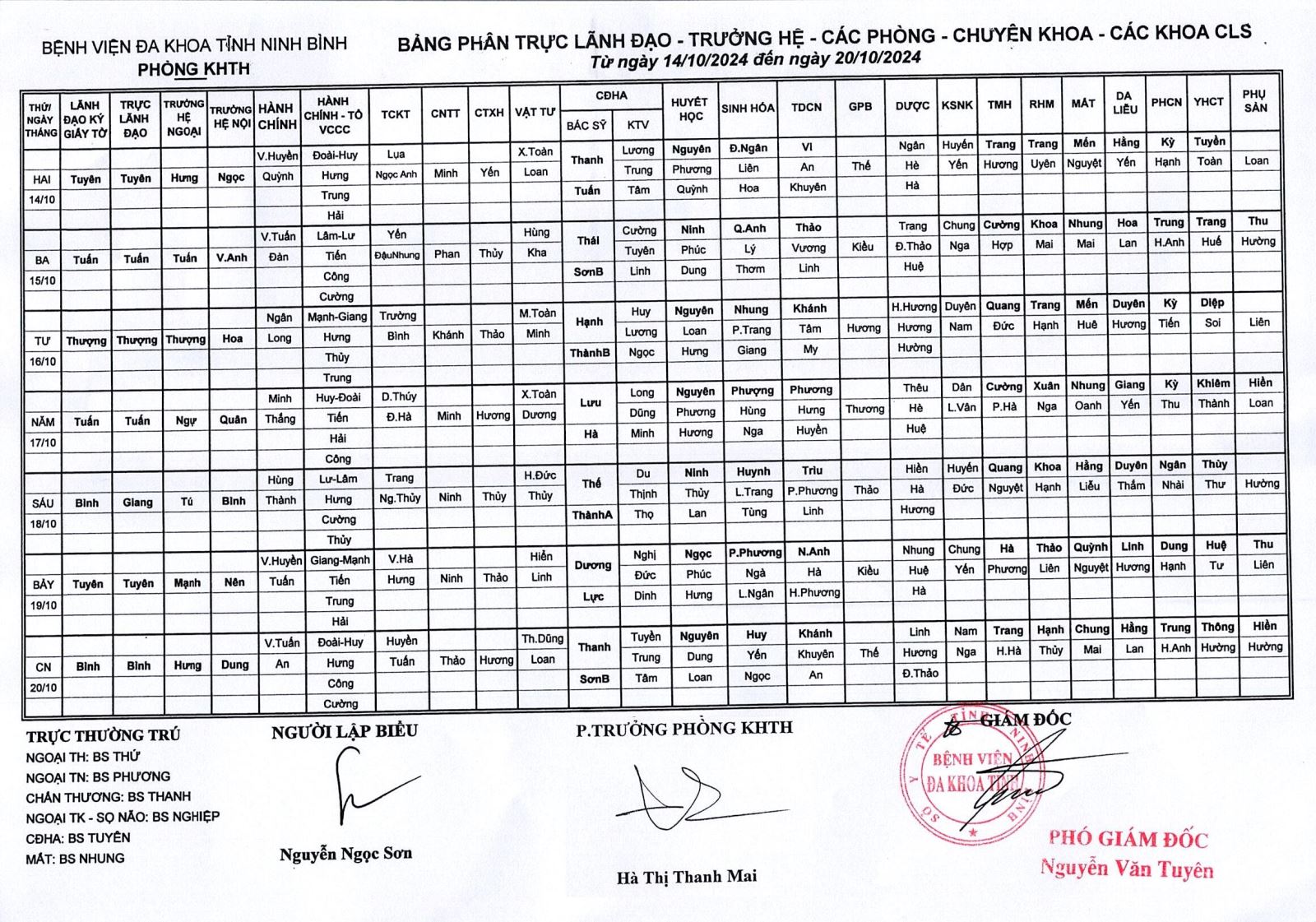 Bảng phân trực Lãnh đạo - Trưởng hệ - các phòng - chuyên khoa - các khoa CLS (từ ngày 14 đến ngày 20 tháng 10 năm 2024).