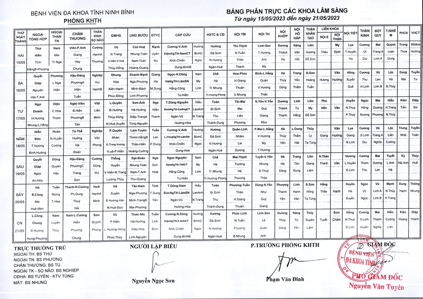 Bảng phân trực Lãnh đạo - Trưởng hệ - các phòng - chuyên khoa - các khoa CLS (từ ngày 15 đến ngày 21 tháng 5 năm 2023).
