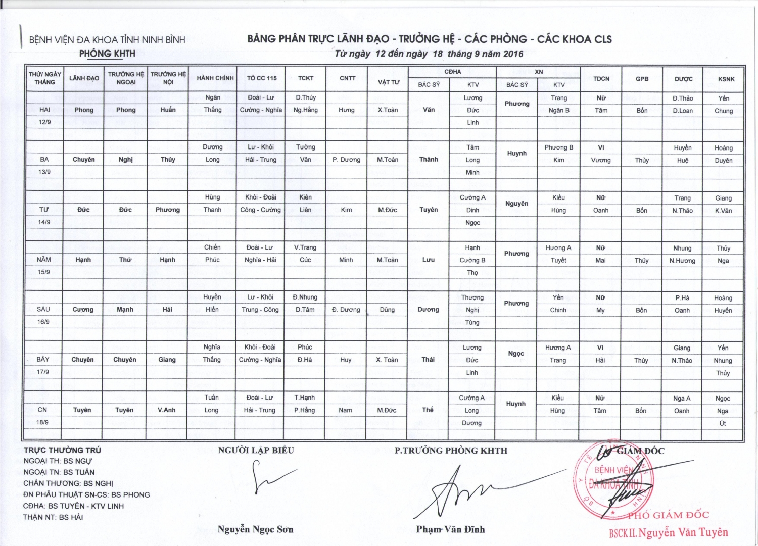 Bảng phân trực Lãnh đạo - trưởng hệ - các phòng - các khoa CLS (từ ngày 12 đến ngày 18 tháng 9 năm 2016)
