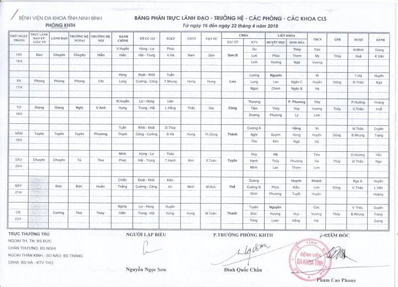 Bảng phân trực Lãnh đạo - Trưởng hệ - các phòng - các khoa CLS (từ ngày 16 đến ngày 22 tháng 4 năm 2018)