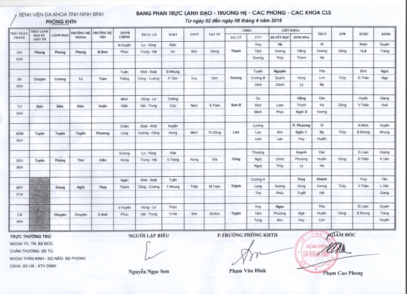 Bảng phân trực Lãnh đạo - Trưởng hệ - các phòng - các khoa CLS (từ ngày 2 đến ngày 8 tháng 4 năm 2018)