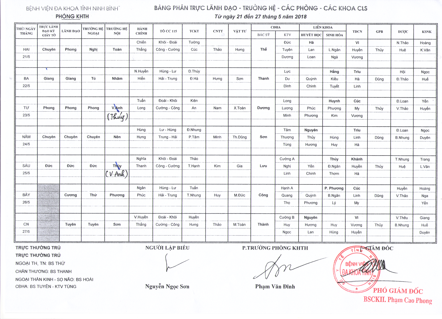 Bảng phân trực Lãnh đạo - Trưởng hệ - các phòng - các khoa CLS (từ ngày 21 đến ngày 27 tháng 5 năm 2018)