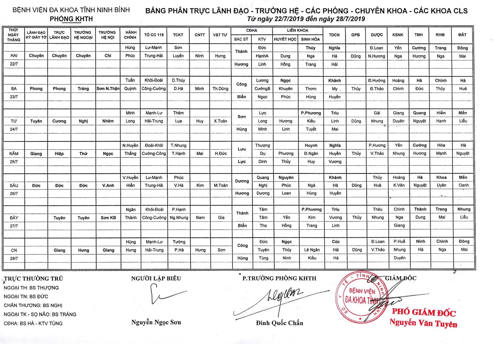 Bảng phân trực Lãnh đạo - Trưởng hệ - các phòng - các khoa CLS (từ ngày 22 đến ngày 28 tháng 7 năm 2019)