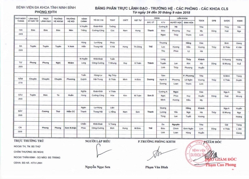 Bảng phân trực Lãnh đạo - Trưởng hệ - các phòng - các khoa CLS (từ ngày 24 đến ngày 30 tháng 9 năm 2018)