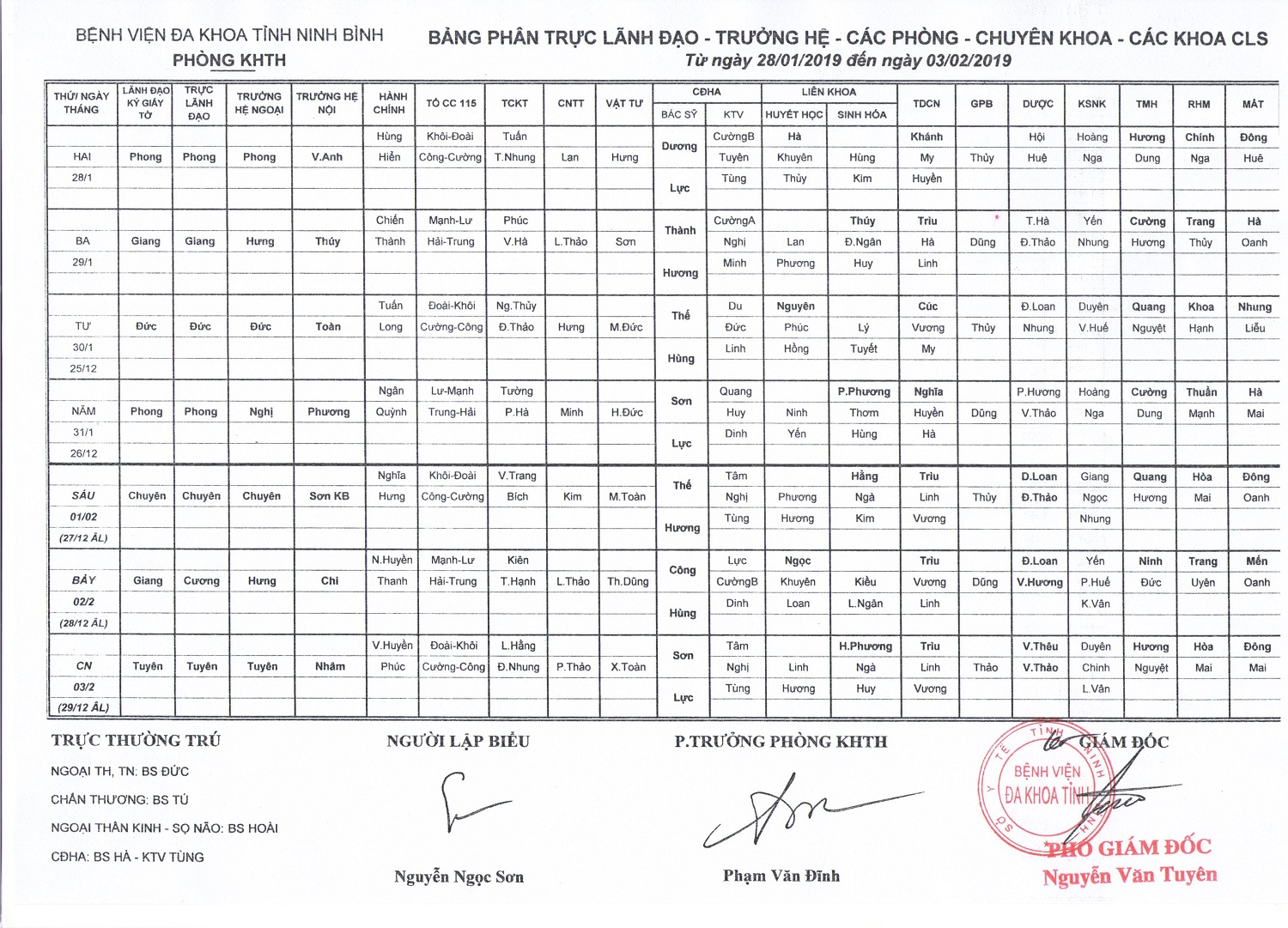 Bảng phân trực Lãnh đạo - Trưởng hệ - các phòng - các khoa CLS (từ ngày 28 tháng 1 đến ngày 3 tháng 2 năm 2019)