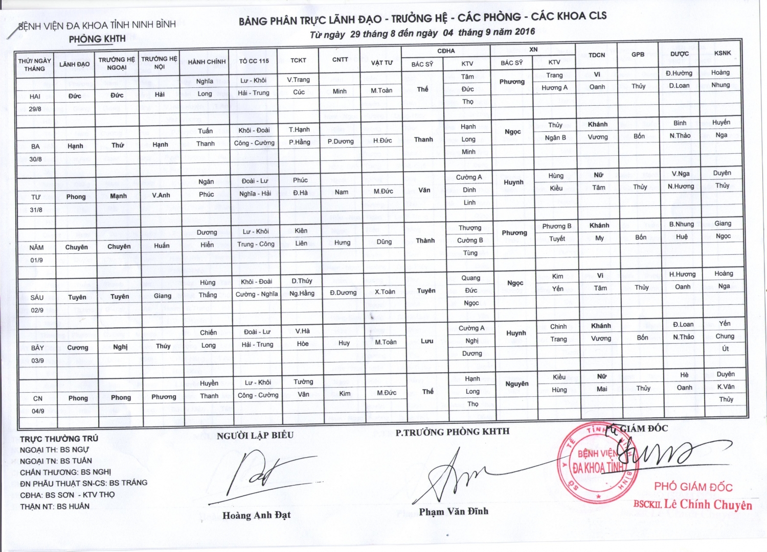 Bảng phân trực Lãnh đạo - trưởng hệ - các phòng - các khoa CLS (từ ngày 29 tháng 8 đến 4 tháng 9 năm 2016)