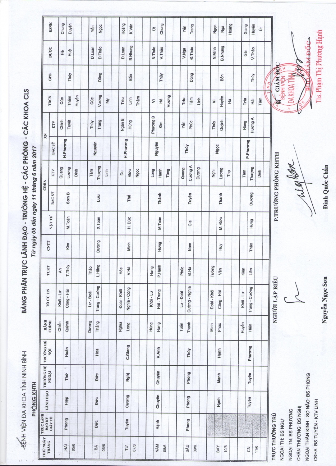 Bảng phân trực Lãnh đạo - Trưởng hệ - các phòng - các khoa CLS (từ ngày 5 đến ngày 11 tháng 6 năm 2017)