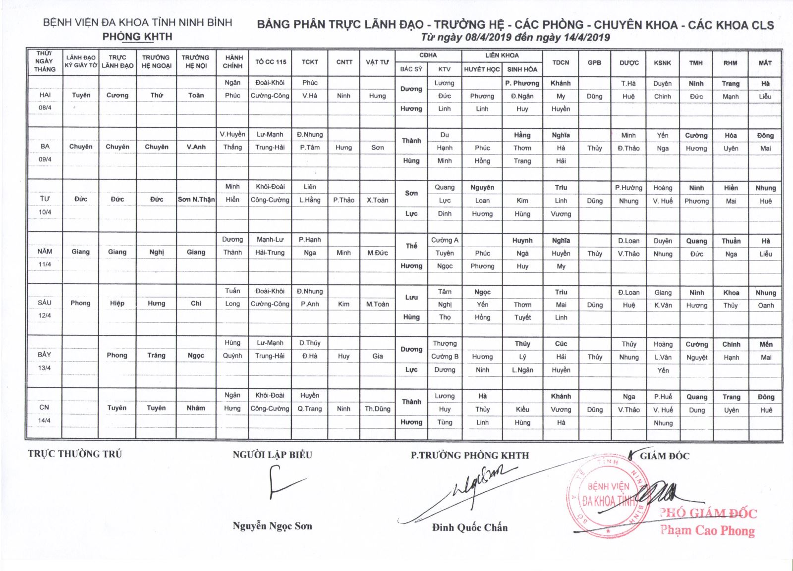 Bảng phân trực Lãnh đạo - Trưởng hệ - các phòng - các khoa CLS (từ ngày 8 đến ngày 14 tháng 4 năm 2019)