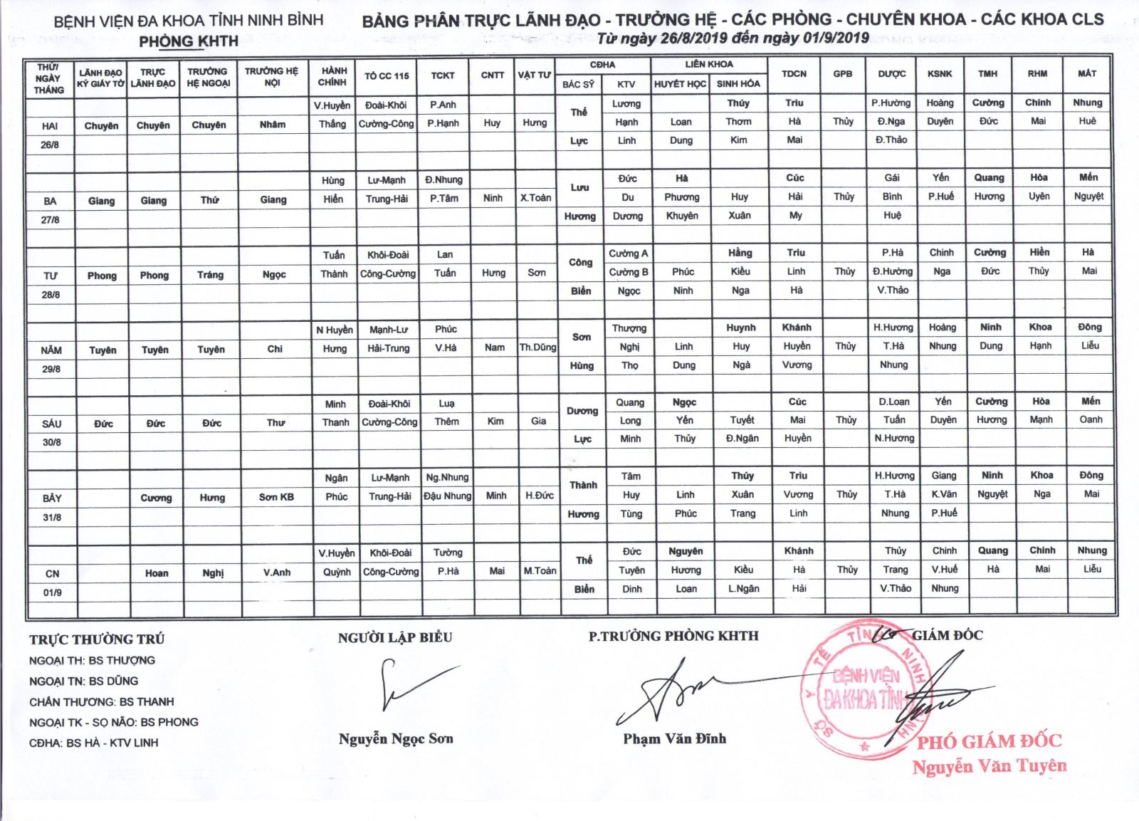 Bảng phân trực Lãnh đạo - Trưởng hệ - các phòng - các khoa CLS(từ ngày 26 tháng 8 đến ngày 1 tháng 9 năm 2019)