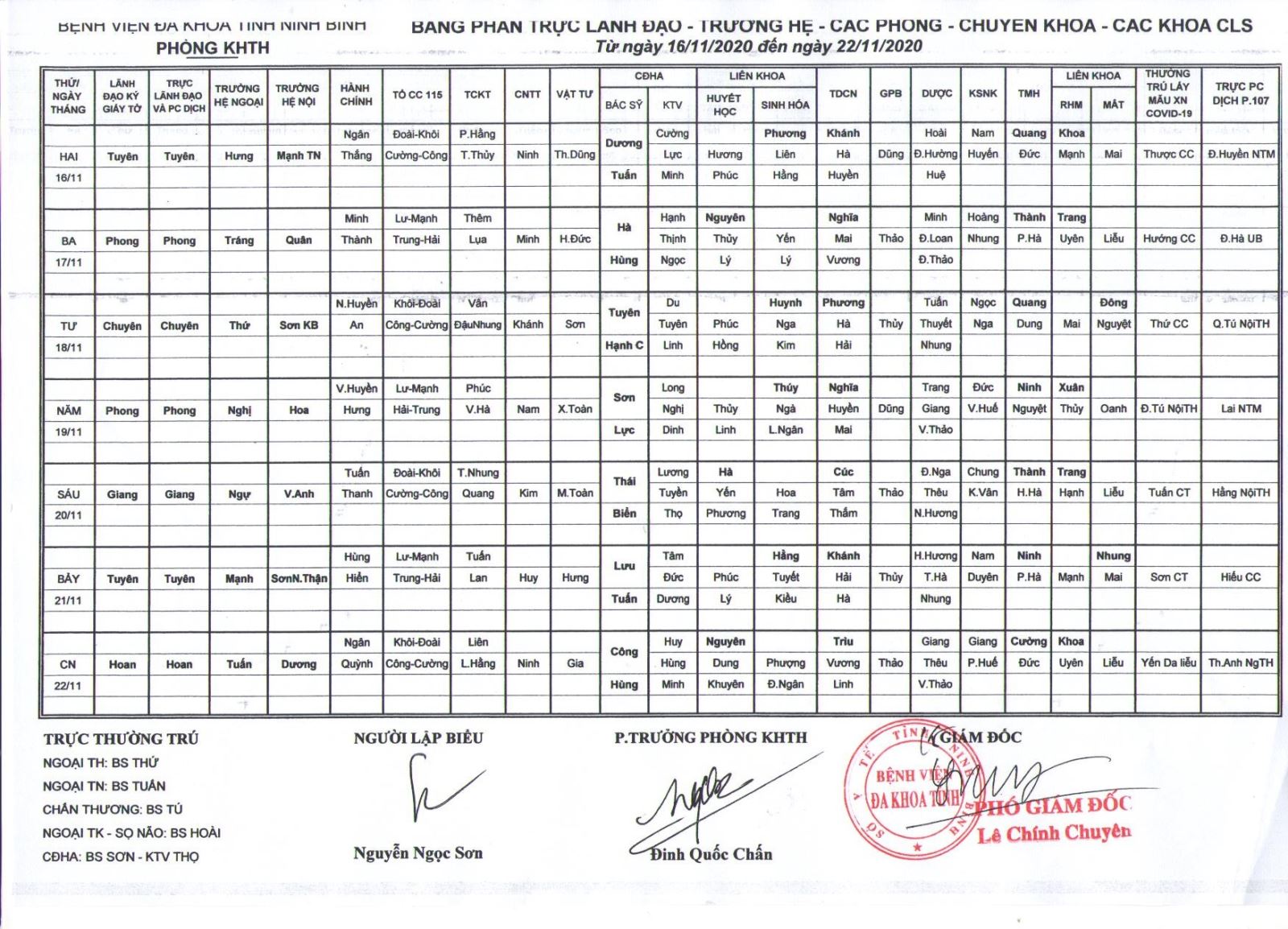 Bảng phân trực Lãnh đạo - Trưởng hệ - các phòng - chuyên khoa - các khoa Cận Lâm sàng (từ ngay 16 đến ngày 22 tháng 11 năm 2020)