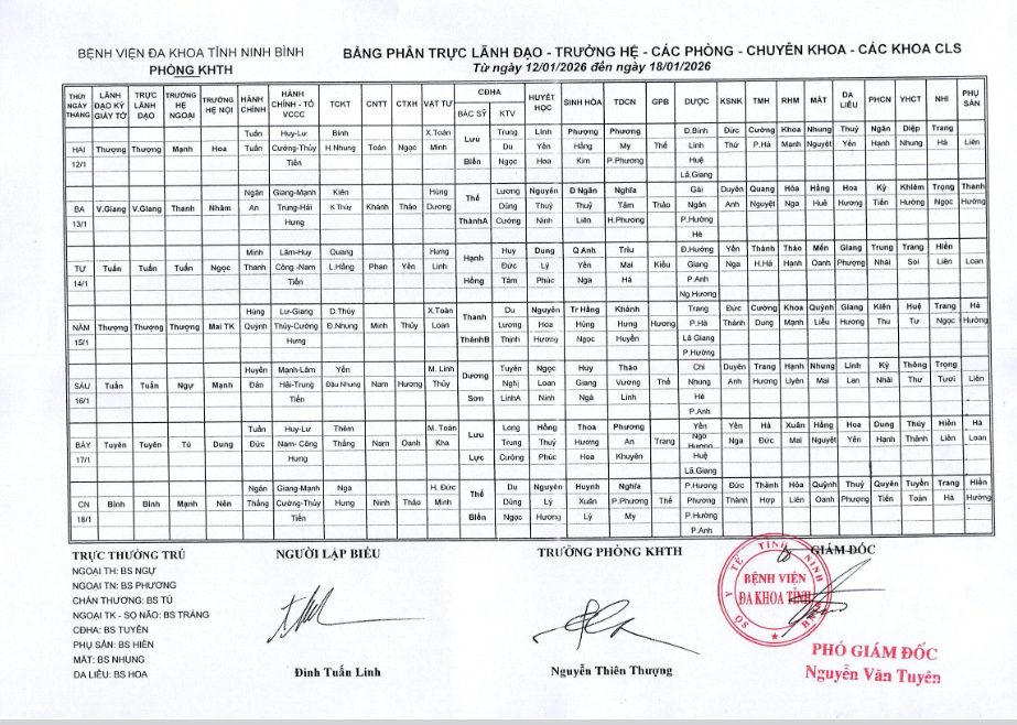 Bảng phân trực Lãnh đạo - Trưởng hệ - các phòng - Chuyên khoa - các khoa CLS (từ ngày 12 đến ngày 18 tháng 1 năm 2026).