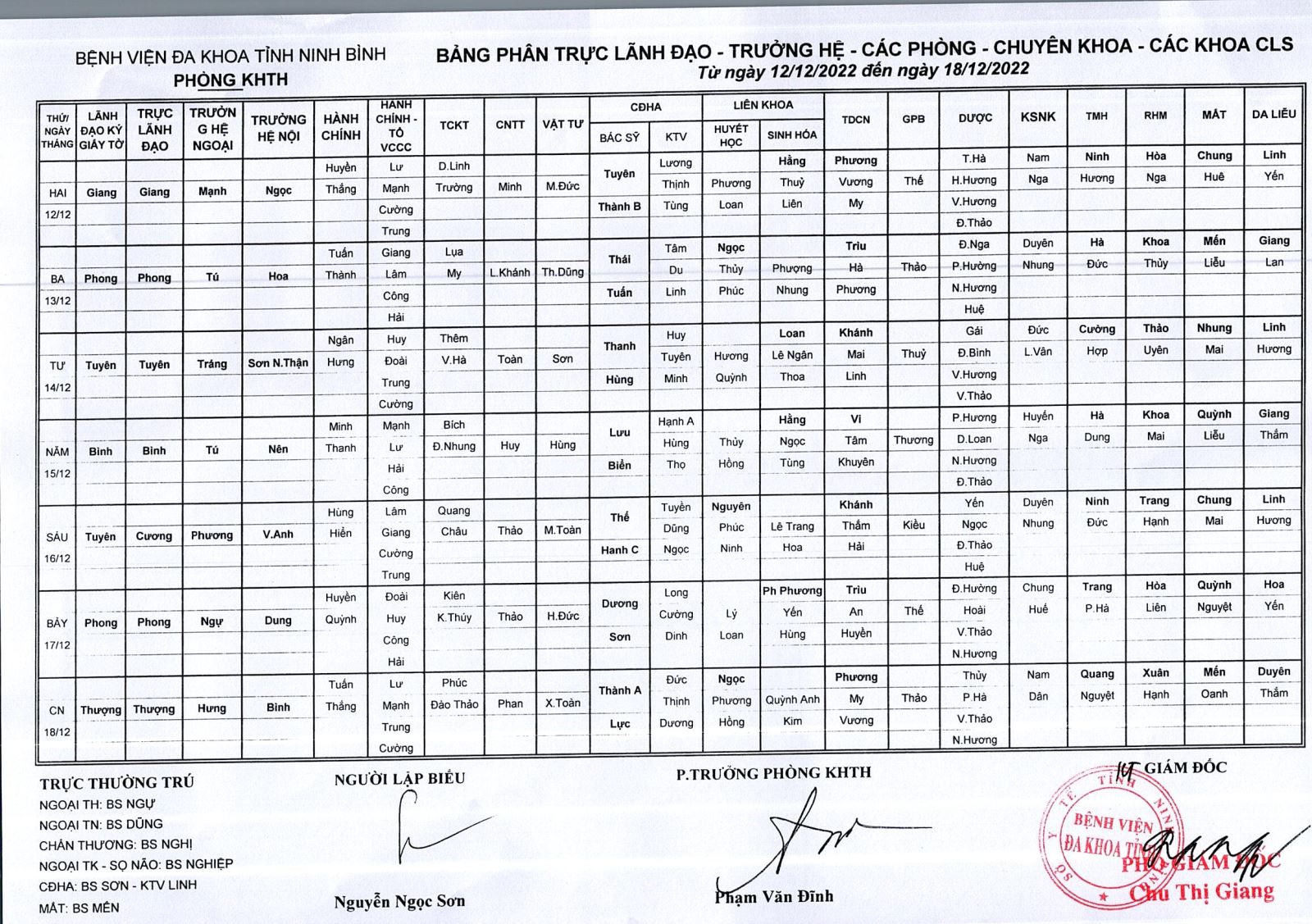 Bảng phân trực Lãnh đạo - Trưởng hệ - các phòng - chuyên khoa - các khoa CLS (từ ngày 12 đến ngày 18 tháng 12 năm 2022).
