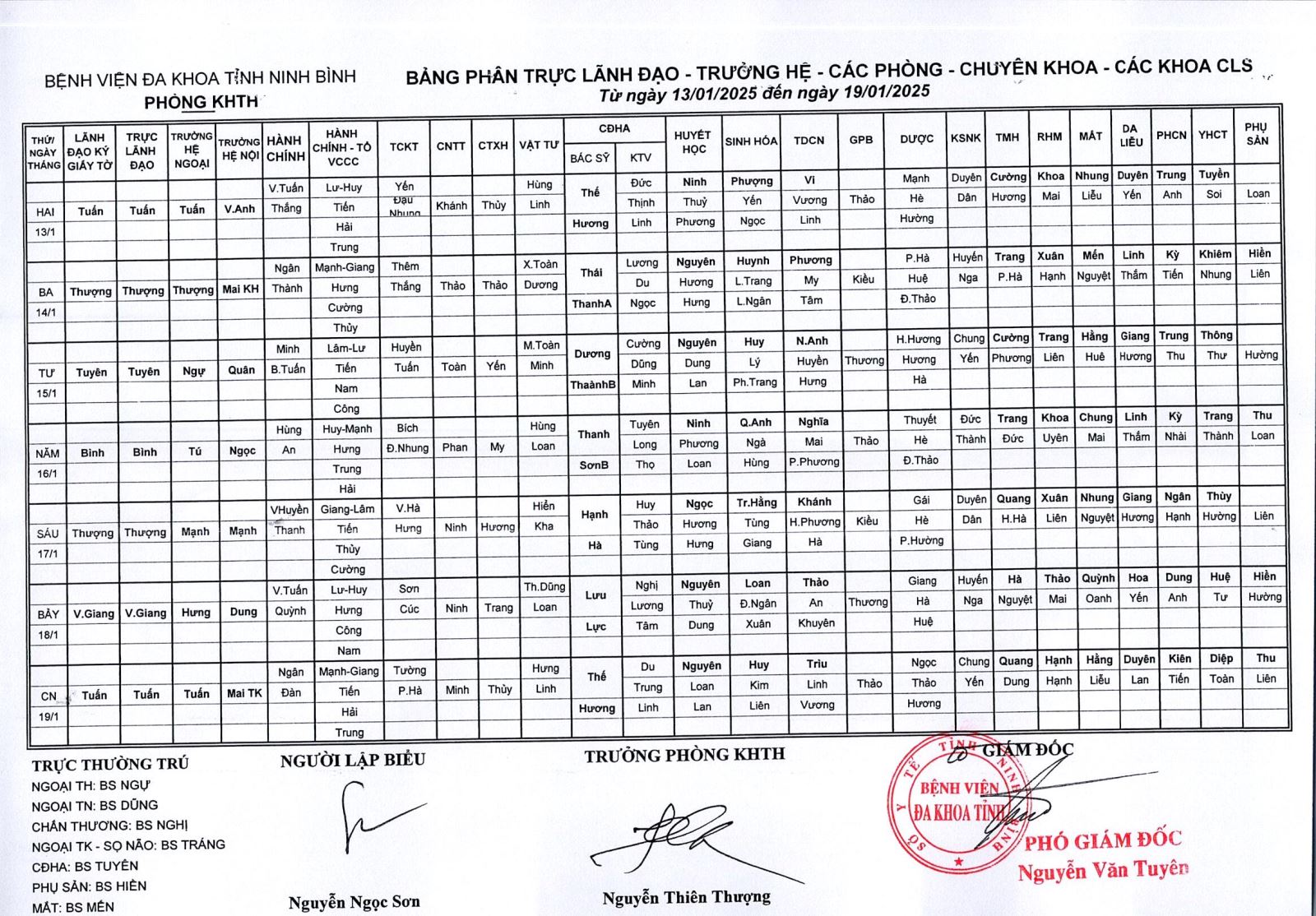 Bảng phân trực Lãnh đạo - Trưởng hệ - các phòng - Chuyên khoa - các khoa CLS (từ ngày 13 đến ngày 19 tháng 1 năm 2025).