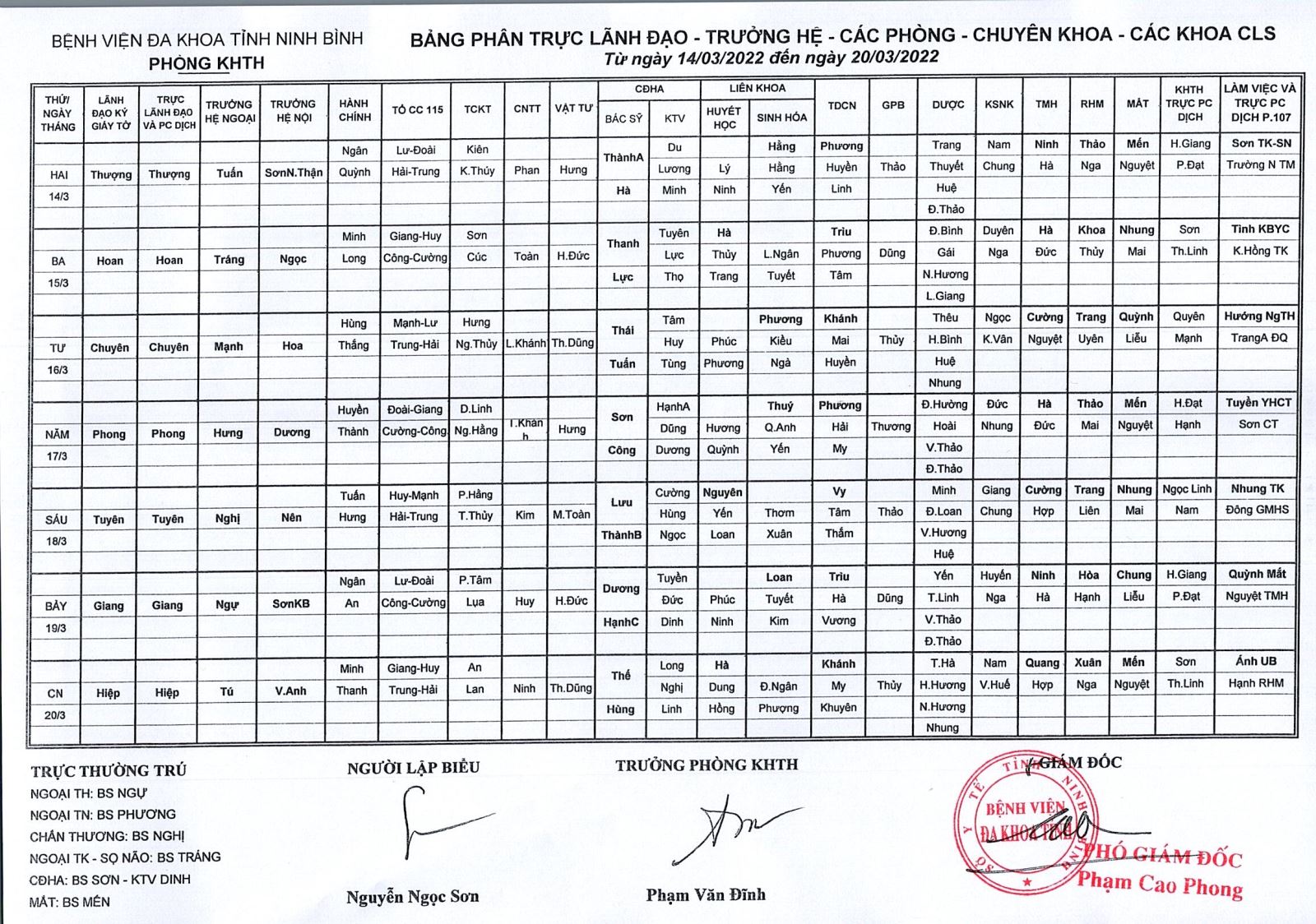 Bảng phân trực Lãnh đạo - Trưởng hệ - các phòng - chuyên khoa - các khoa CLS (từ ngày 14 đến ngày 20 tháng 3 năm 2022).