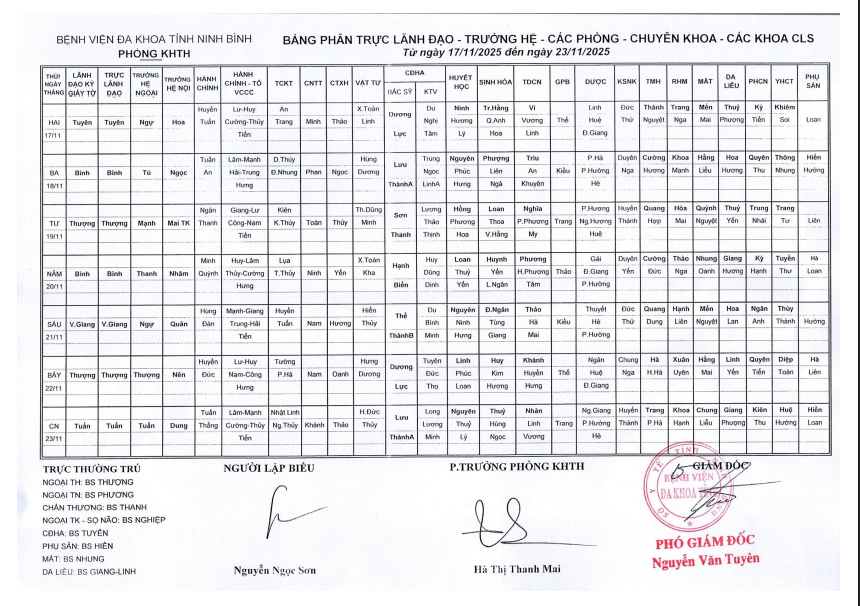 Bảng phân trực Lãnh đạo - Trưởng hệ - các phòng - Chuyên khoa - các khoa CLS (từ ngày 17 đến ngày 23 tháng 11 năm 2025)