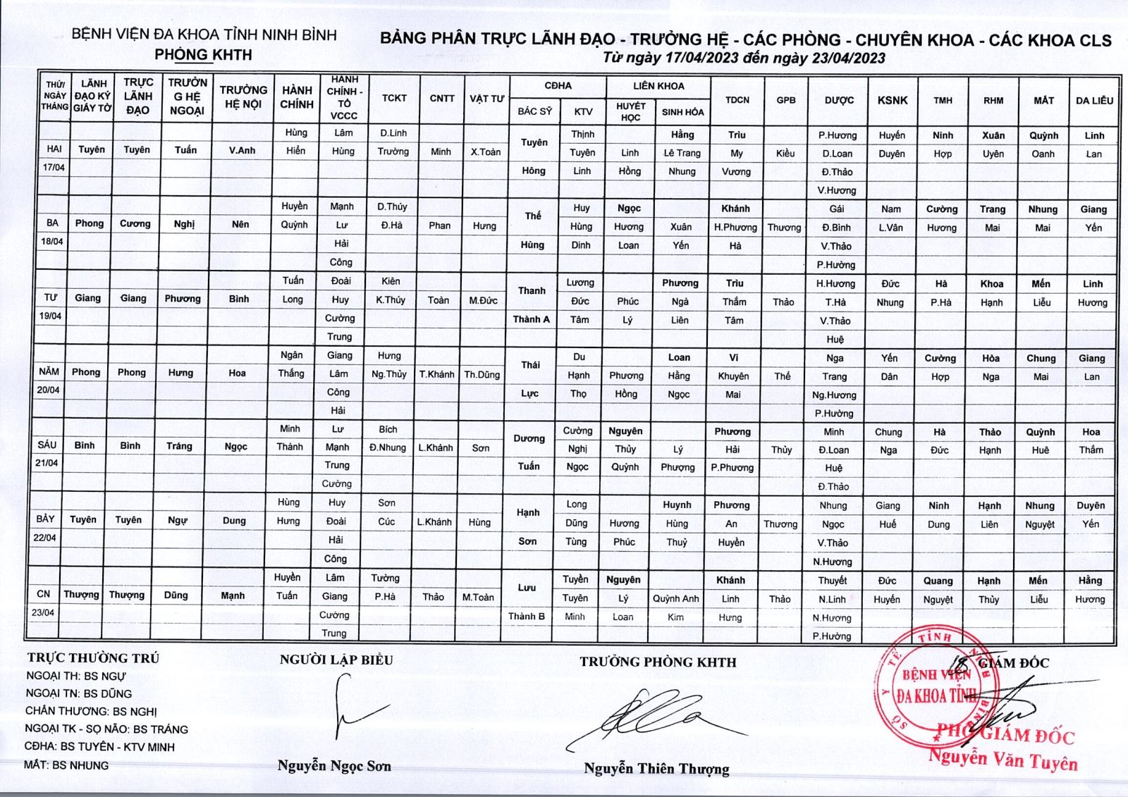 Bảng phân trực Lãnh đạo - Trưởng hệ - các phòng - chuyên khoa - các khoa CLS (từ ngày 17 đến ngày 23 tháng 4 năm 2023).