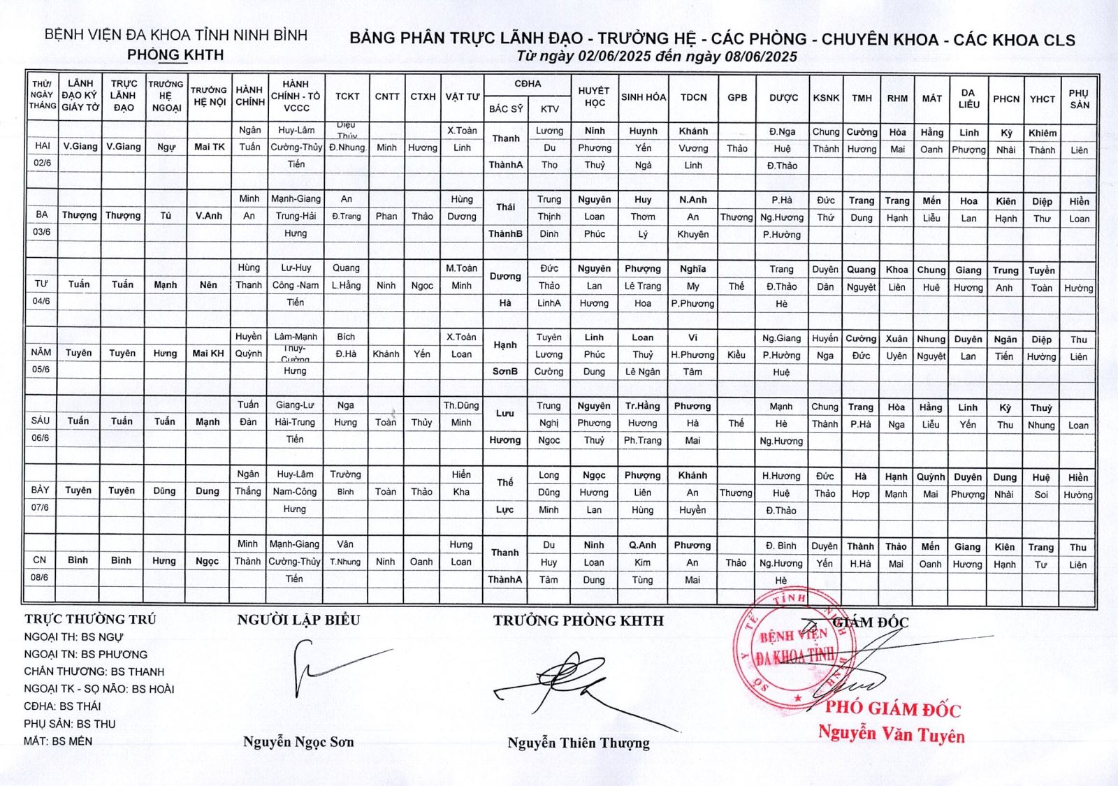 Bảng phân trực Lãnh đạo - Trưởng hệ - các phòng - Chuyên khoa - các khoa CLS (từ ngày 2 đến ngày 8 tháng 6 năm 2025).