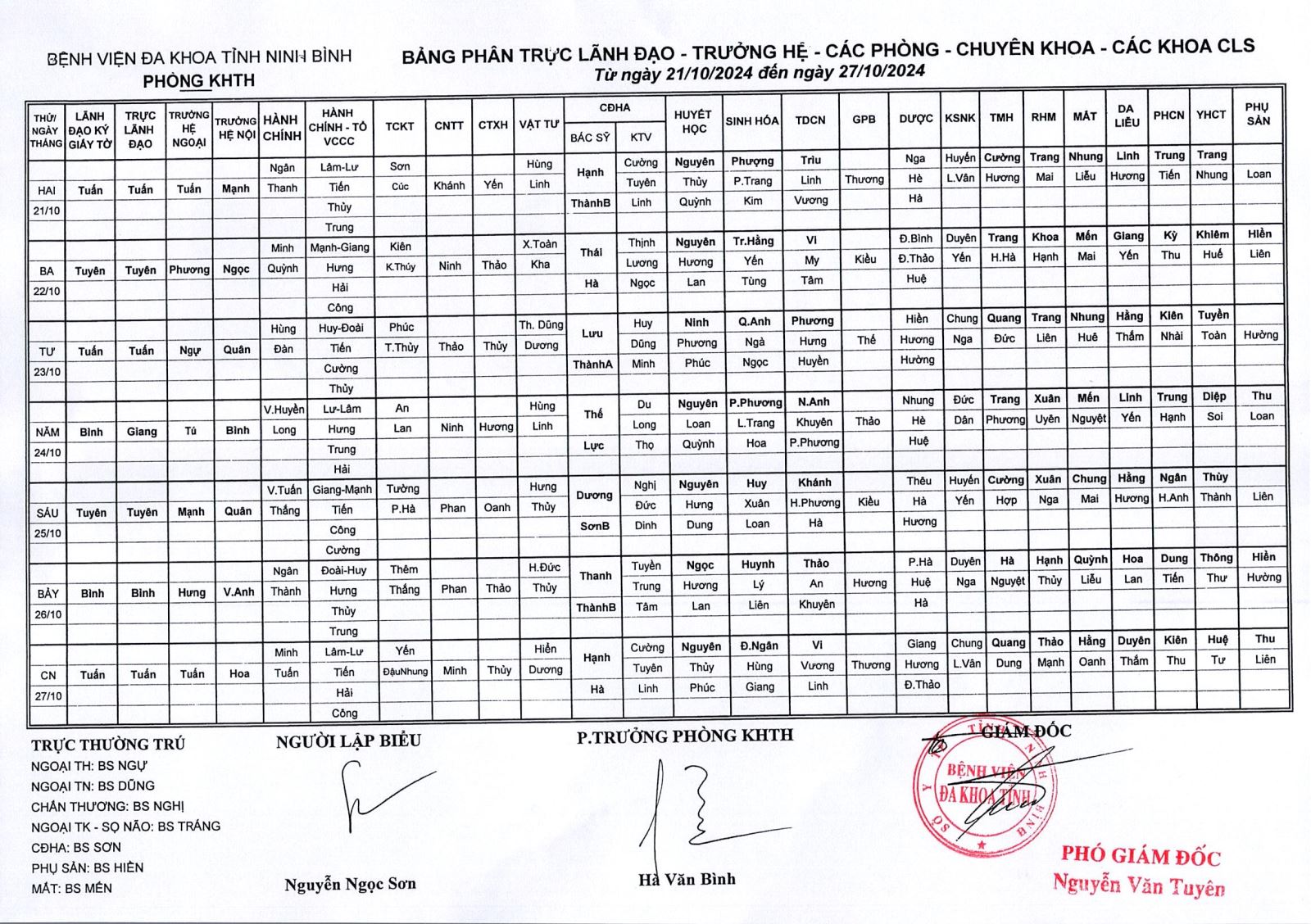 Bảng phân trực Lãnh đạo - Trưởng hệ - các phòng - Chuyên khoa - các khoa CLS (từ ngày 21 đến ngày 27 tháng 10 năm 2024).