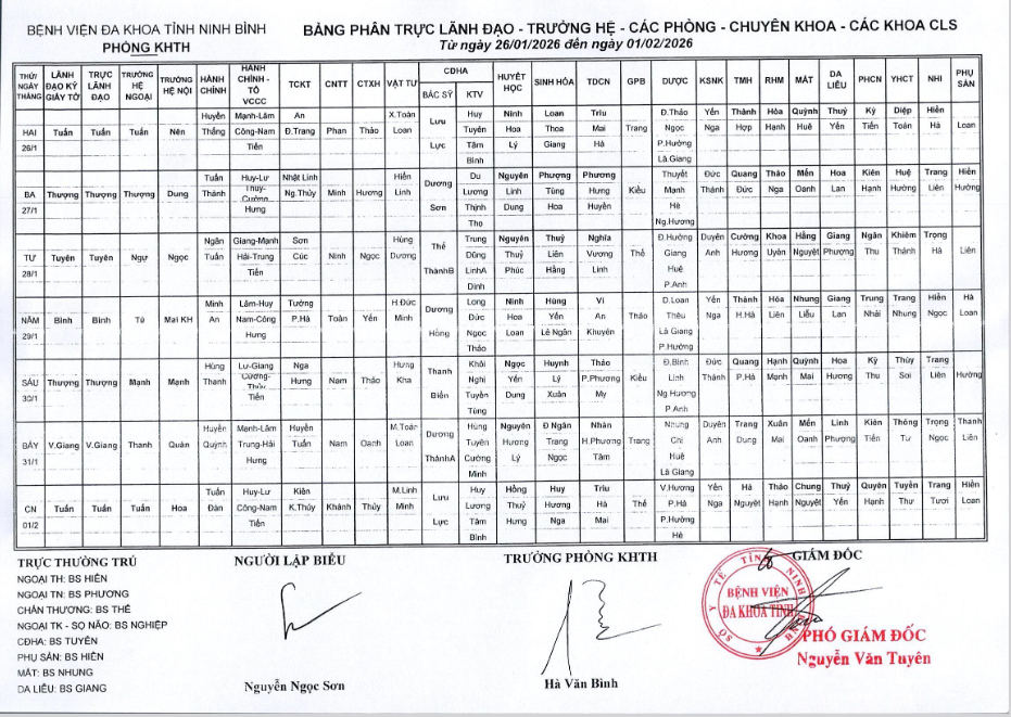 Bảng phân trực Lãnh đạo - Trưởng hệ - các phòng - Chuyên khoa - các khoa CLS (từ ngày 26 tháng 1 đến ngày 1 tháng 2 năm 2026).