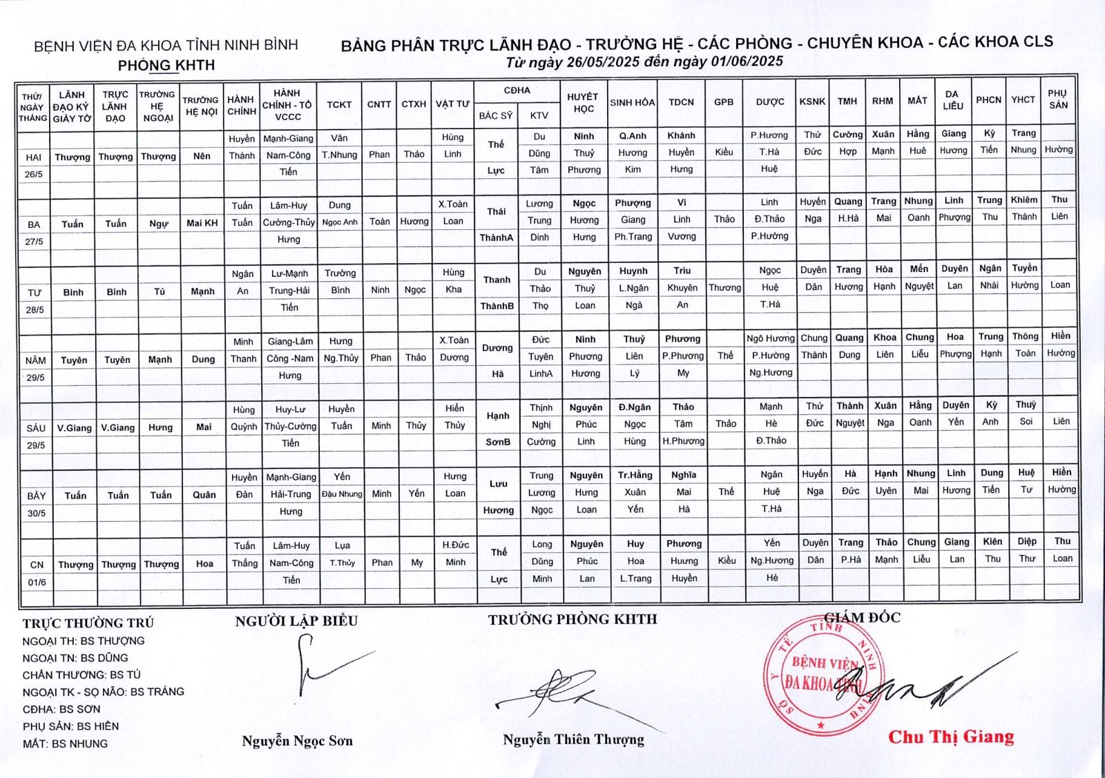 Bảng phân trực Lãnh đạo - Trưởng hệ - các phòng - Chuyên khoa - các khoa CLS (từ ngày 26 tháng 5 đến ngày 1 tháng 6 năm 2025).