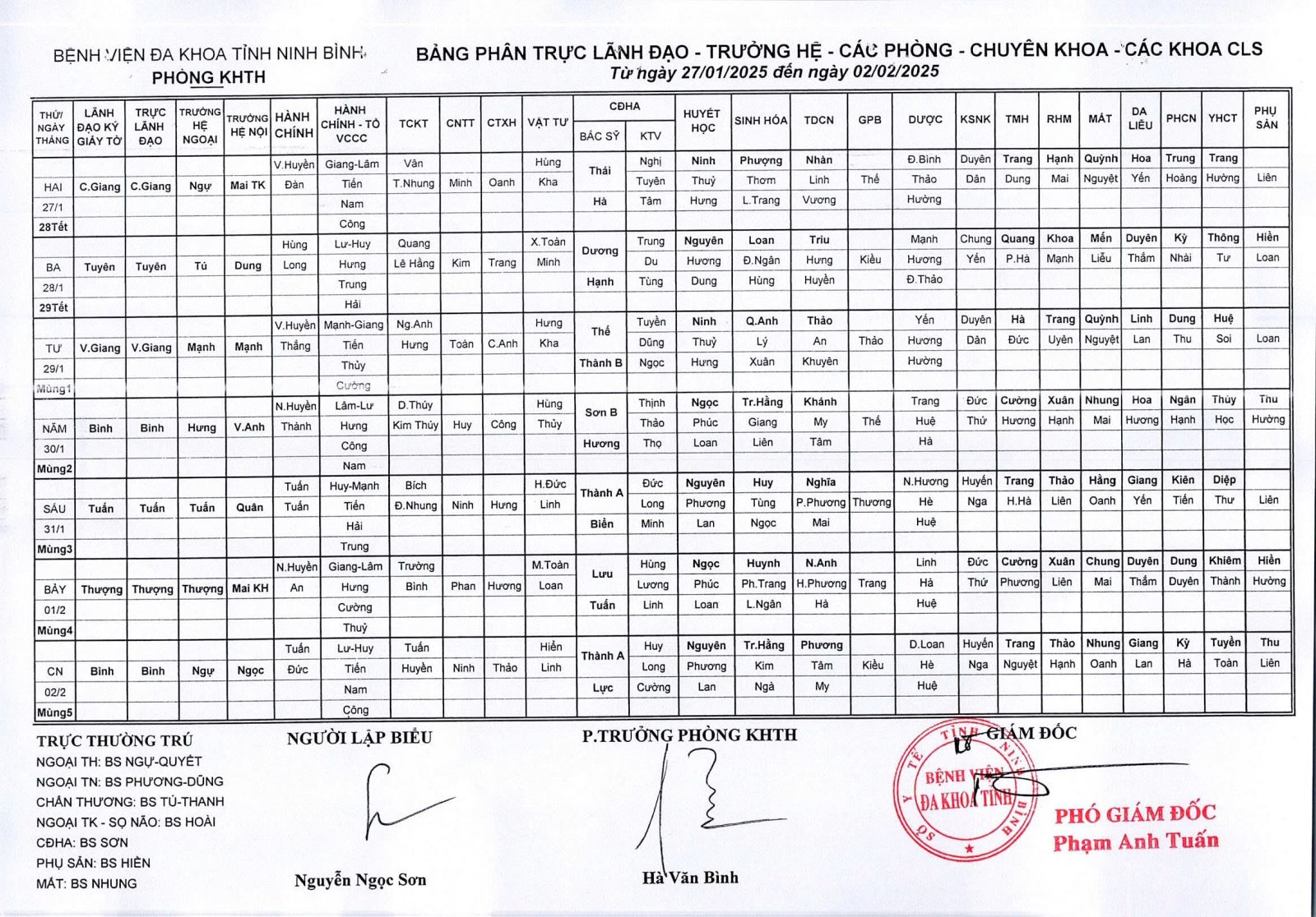 Bảng phân trực Lãnh đạo - Trưởng hệ - các phòng - chuyên khoa - các khoa CLS (từ ngày 27 tháng 1 đến 2 tháng 2 năm 2025).
