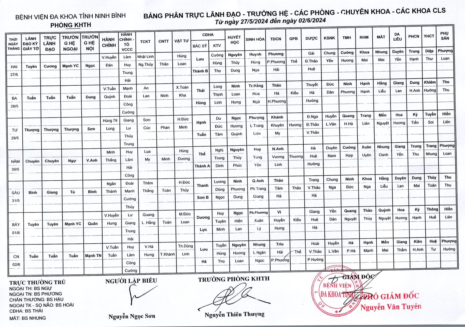 Bảng phân trực Lãnh đạo - Trưởng hệ - các phòng - Chuyên khoa - các khoa CLS (từ ngày 27 tháng 5 đến ngày 2 tháng 6 năm 2024).