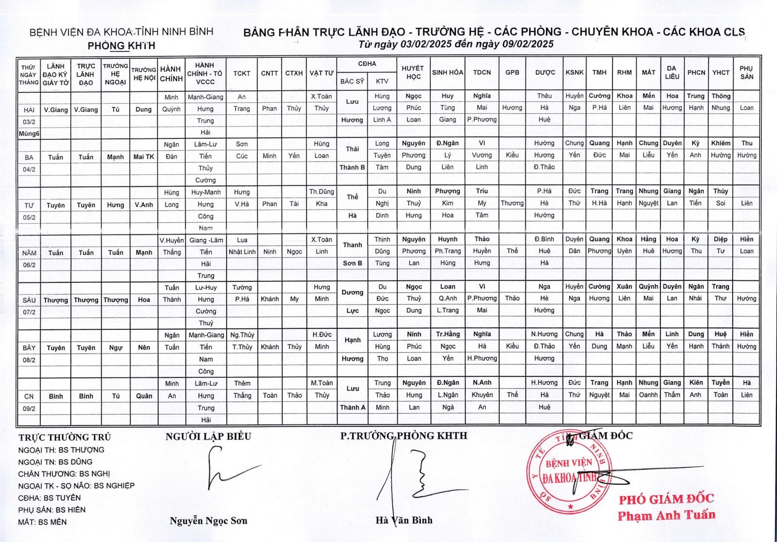 Bảng phân trực Lãnh đạo - Trưởng hệ - các phòng - Chuyên khoa - các khoa CLS (từ ngày 3 đến ngày 9 tháng 2 năm 2025).