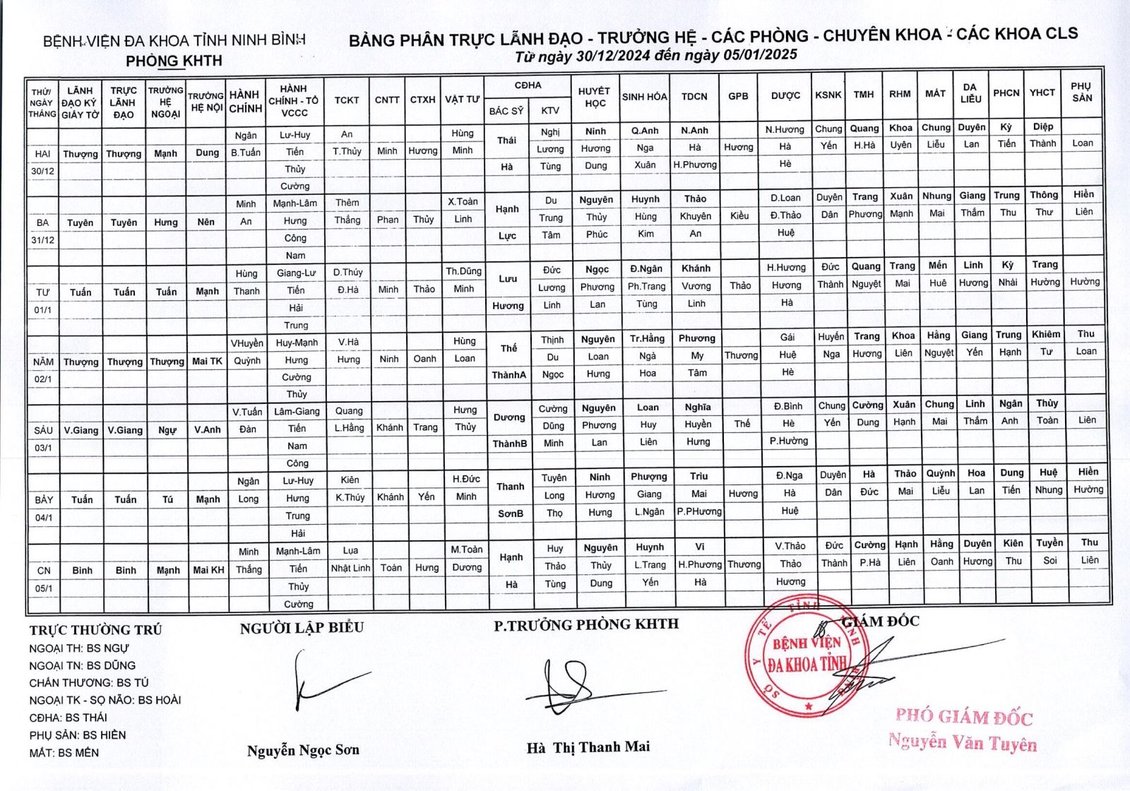 Bảng phân trực Lãnh đạo - Trưởng hệ - các phòng - chuyên khoa - các khoa CLS (từ ngày 30 tháng 12 năm 2024 đến ngày 5 tháng 1 năm 2025).