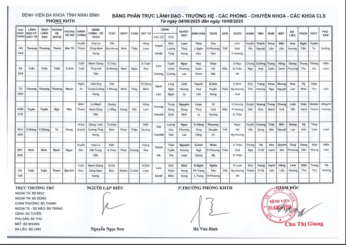 Bảng phân trực lãnh đạo - Trưởng hệ - các phòng - Chuyên khoa - các khoa CLS (từ ngày 4 đến ngày 10 tháng 8 năm 2025)